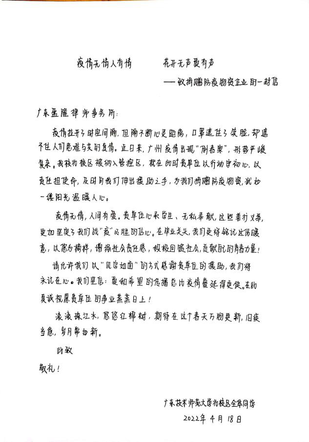 疫情无情,人间有爱。4月18日,在阻击疫情的艰难时刻,来自广东盈隆律师事务所捐赠的3500个口罩千里驰援送进北校区,为同学们带来温暖正能量。